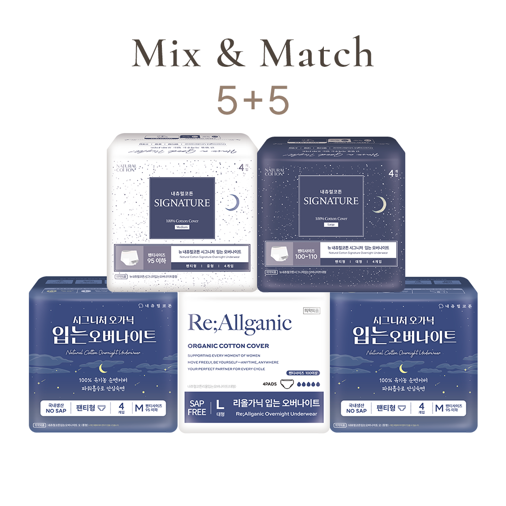 [5+5팩 골라담기] 시그니처 오가닉·순면·리올가닉 입는 오버나이트 팬티형 생리대 M/L