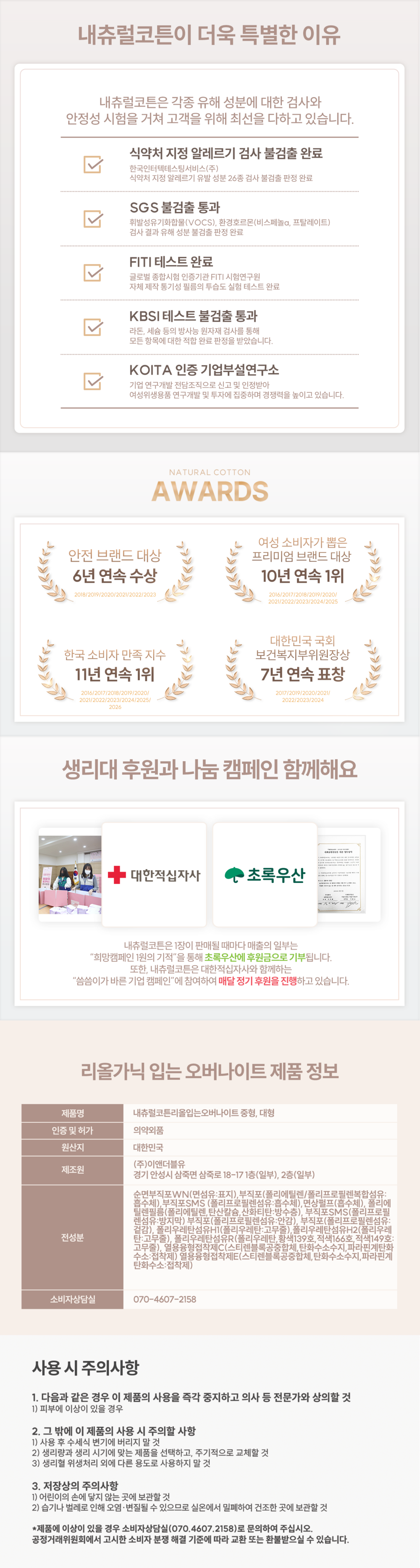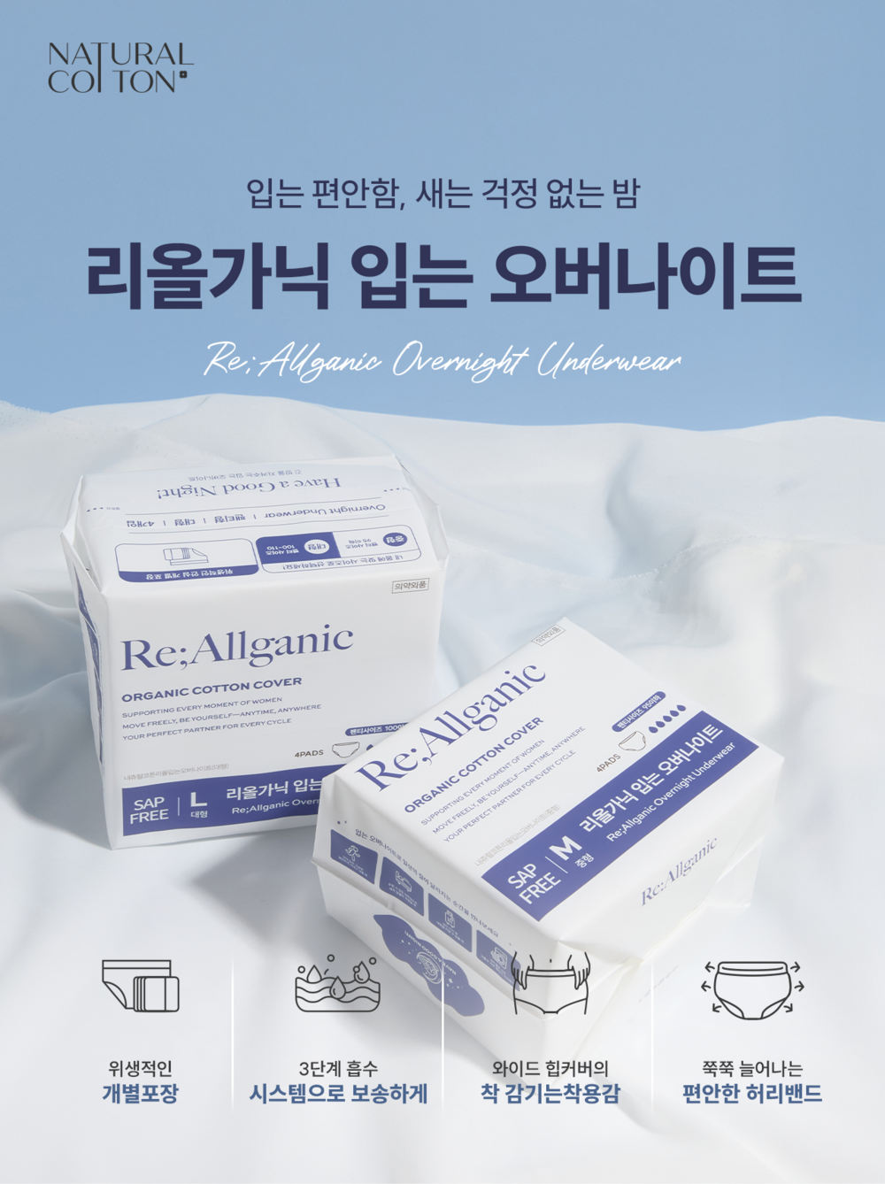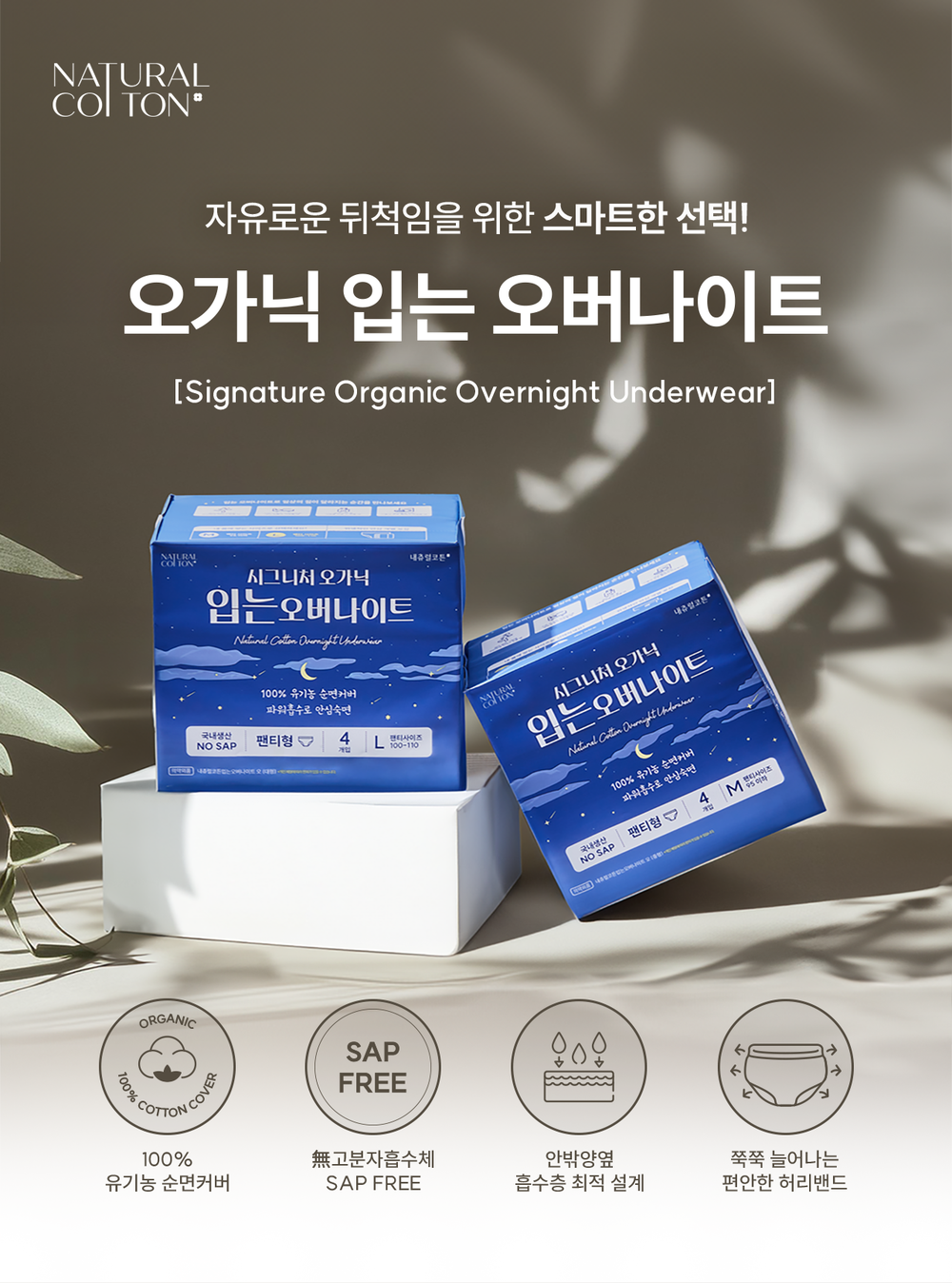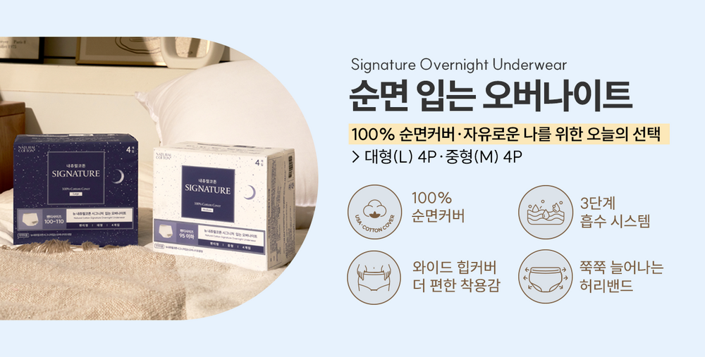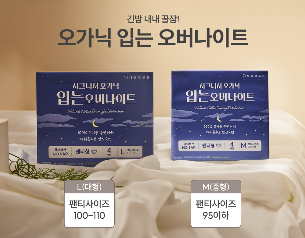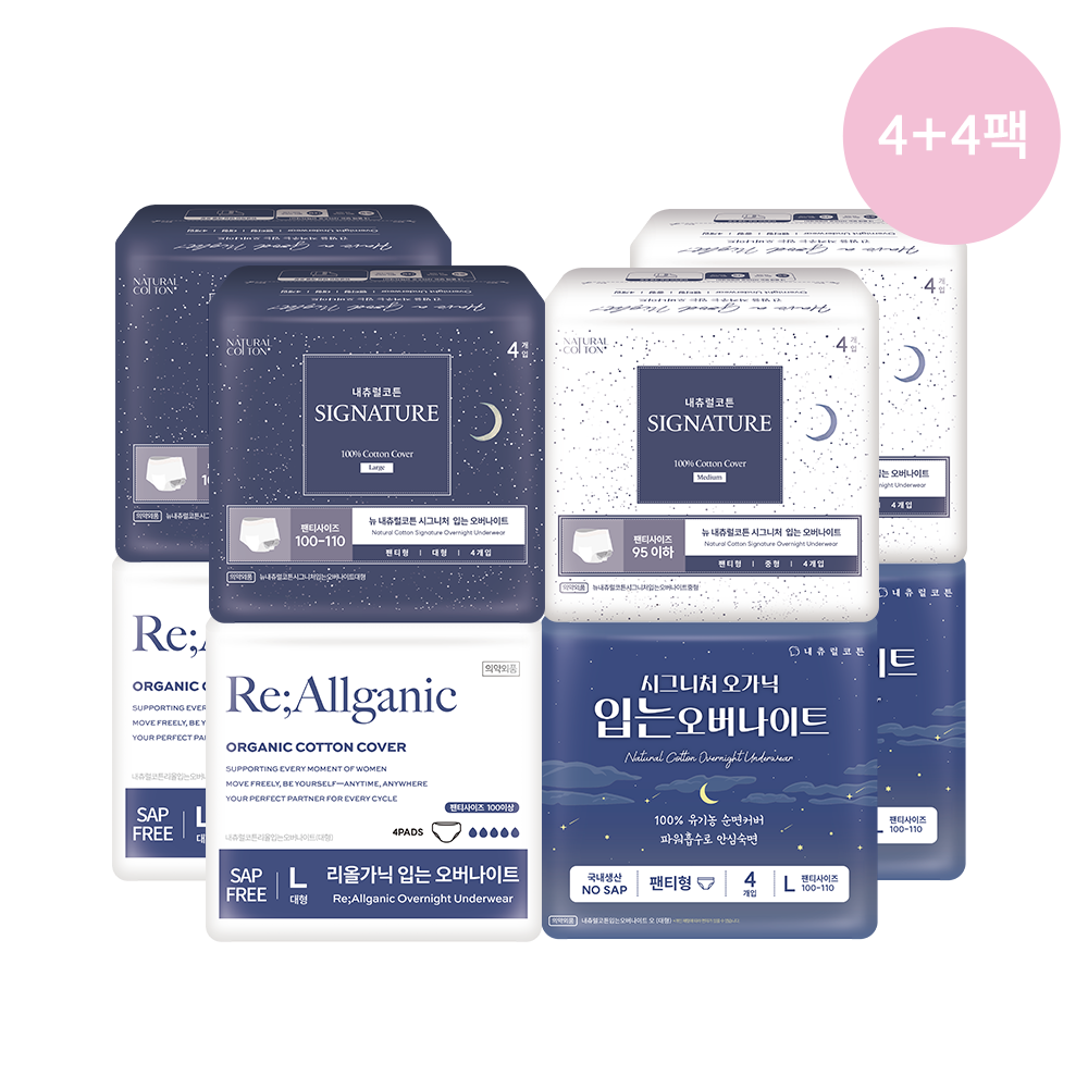 [4+4팩 골라담기] 시그니처 오가닉·순면·리올가닉 입는 오버나이트 팬티형 생리대 M/L