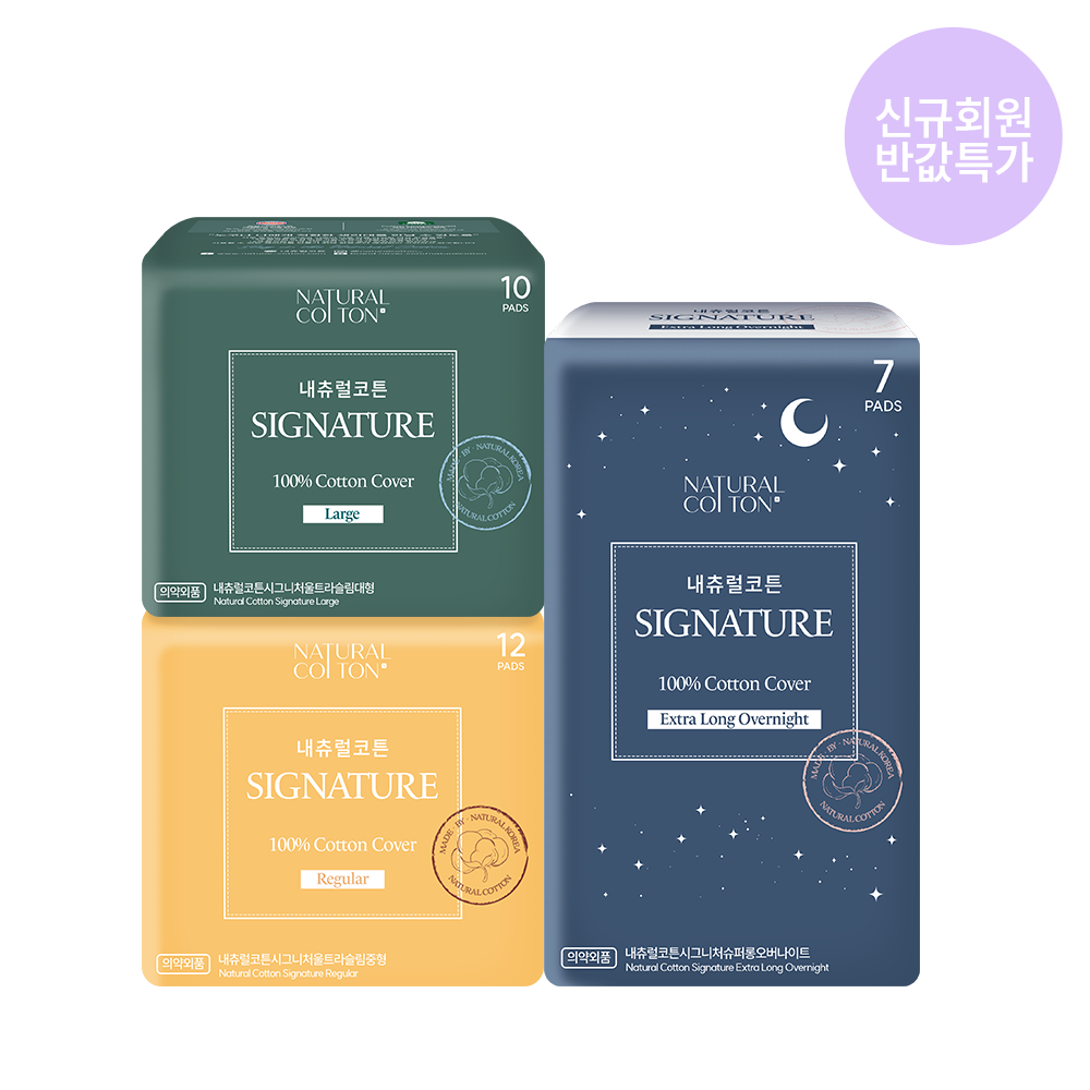 [신규회원 반값특가] 시그니처 순면커버 생리대 3팩 세트(중형1팩+대형1팩+오버1팩)